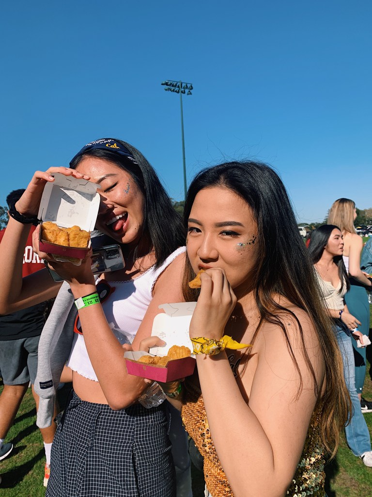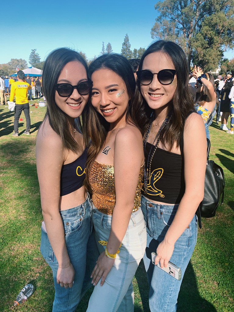 I personally only went out for the big ones so cal day, usc game, big game so I went not over the top, but lots of glitter and a little e x t r a, since these are the days that people go more all out. But, for normal game days, people dress up in a range: anything from oversized Berkeley shirt and shorts, or full on yellow and blue overalls. I don’t know if this is just Berkeley, but a lot of Berkeley sorority girls sometimes like to dress up in that “ugly/troll aesthetic” if you know what I mean. Like you know, socks and sandals, troll sunglasses, but all on theme of yellow/gold and blue.